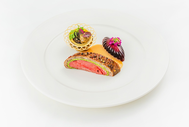 Polędwica wołowa z mousselinem/ziemniak z gulaszem wołowym, brukselką i grzybami/ćwikła z chrzanem i pasternakiem/pralina grzybowa/ciemny sos z musztardą