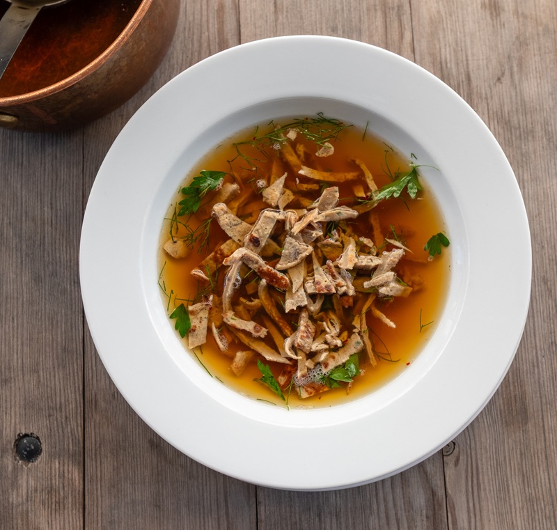 Rosół polski szafranowy, gotowany z trzech mięs, klarowany, podany z wątróbkowymi kluseczkami
