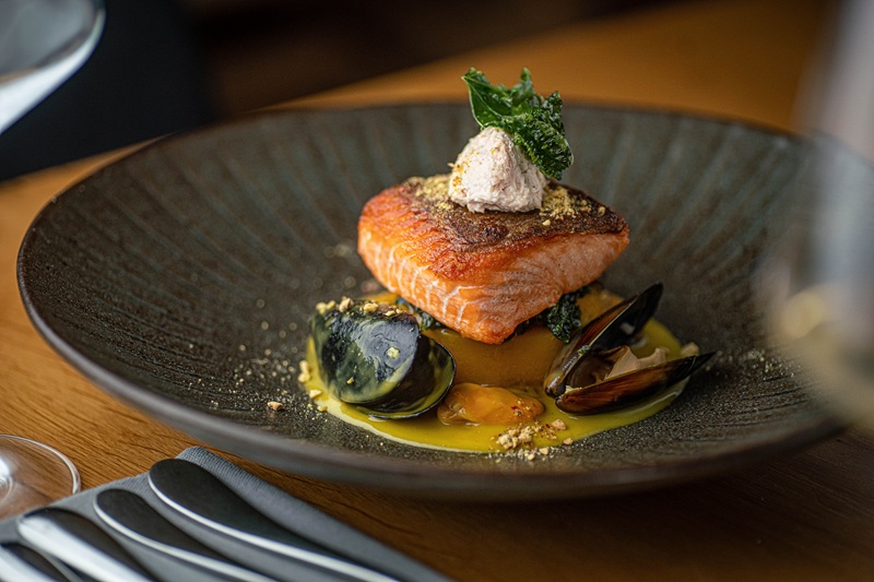 Troć, dynia piżmowa, velouté szafranowe, mule, pistacje